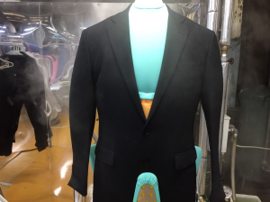 | ドライクリーニングで油汚れをきれいに落とした後、特殊な水洗いと加工を行い、形崩れしないように専用ハンガーとスリーパーを使用して乾かします。 | 乾いたら、人体フォーマーで形をきれいに整えて仕上げます。 |