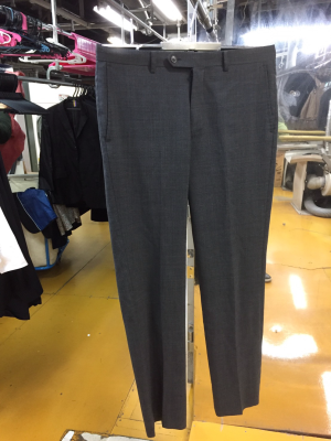 | ズボンも同様に特殊な水洗い後、専用のハンガーを使用して乾かします。 | 機械に穿かせて形を整えシワを伸ばしていきます。その後プレス機、細部はアイロンで仕上げを行います。 |