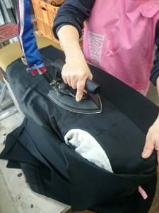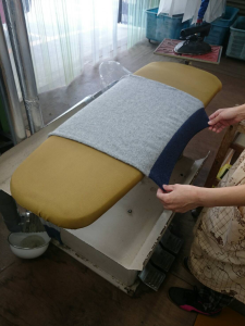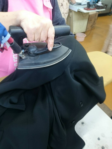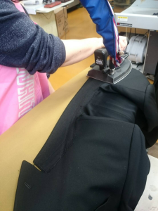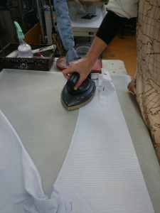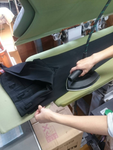 上着は裏からアイロンをかけ、うまを使って型崩れをしない様に仕上げます。